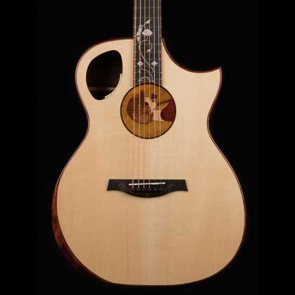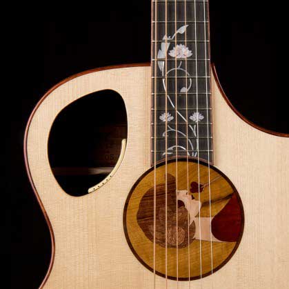 Inspired by arts and crafts of the 19th century Art Nouveau era, the Roselyn LE is a true masterpiece that incorporates both classic and modern aesthetics and guitar building techniques. It all started with a carefully crafted wooden inlay in the center of the guitar with a portrait of a young woman holding a rose, and the name Roselyn was born. Unique features such as an off-set sound hole on top and sound port on side, bevel cut on body arm rest, and elegant looking vine/flower mother-of-pearl inlay that branches out from the center inlay all contribute to the beauty and uniqueness of the Roselyn LE.