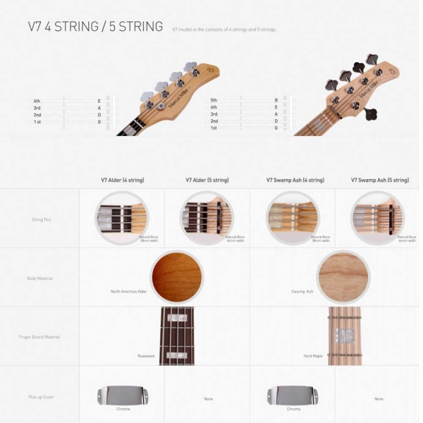 Buy at www.musicianscart.com Sire Marcus Miller V7 Alder – BMR 5 String Bass Guitar,V7,Swamp Ash / North American Alder body,Body Shape New Marcus Miller Jazz Type,1 Piece Hardmaple Neck,C-Shape Neck,34” Scale,Hardmaple(Swamp Ash ) / Rosewood(Alder) fingerboard,Fingerboard Radius 7’25”,Medium Small, 20 Frets,4string : Natural Bone 38mm width / 5string Natural Bone 46mm width,Binding 1 ply Ivory,Inlay WH Pearloid Block,4 Bolt Steel Square Plate Neck joint,Marcus super Jazz pickups,Marcus Heritage- 3 with Middle Frequency Control,Controls Volume / Tone (Dual Pot) | Pickup Blender | Treble | Middle / Middle Frequency (Dual Pot) | Bass, Mini Toggle (Active / Passive ),Jazz Type Black Plastic knob,Heavy Mass Standard bridge, Tuning Gear Premium Open-Gear,Pickgaurd Ivory Pearl(Swamp Ash) / Tortoise(Alder)